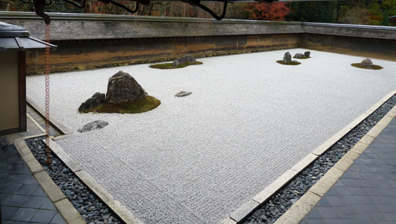 RYÔAN-JI; The most famous rock gardenThe Zen temple Ryôan-ji (The Temple of the Dragon at Peace) is a Buddhist Zen temple that has been synonymous with the temple's famous kare-sansui, a rock garden. The temple and gardens are listed as one of the Historic Monuments of Ancient Kyoto, and as a UNESCO World Heritage Site. More below... Although it is not entirely sure who built the Rock garden in 1450 it was probably Hosokawa Katsumoto (1430-1473), a warlord and deputy to the Shogun. Katsumoto built his residence and founded a zen temple, Ryôan-ji, on the grounds of an old temple. 400 years earlier existed here a temple built by the powerful Fujiwara family. Although it is the Rock Garden that is best known consists Ryoan-ji also of an aqueous garden, a tea garden and a tea house. Ryoan-ji can be reached directly from Kyoto Station by JR bus in about 35 minutes and is covered by the Japan Rail Pass. Ryoanji is also a five minute bus ride or 20 minute walk west of Kinkakuji. The temple can also be reached by the JR Keifuku Kitano Line and get off at Ryoanji-michi Station from where it is a 5-10 minute walk to Ryoan-ji. |